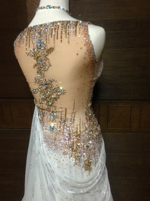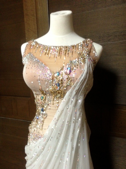 光沢のある生地を使用しています。上半身は前後ともに沢山のストーンで模様が描かれており、背中や肌を出すのに抵抗のある方にも最適です。袖は見た目以上に軽く、よく広がってくれます。
