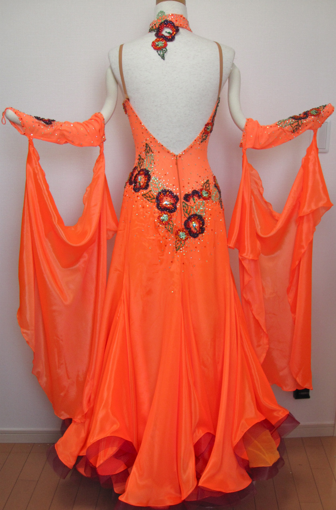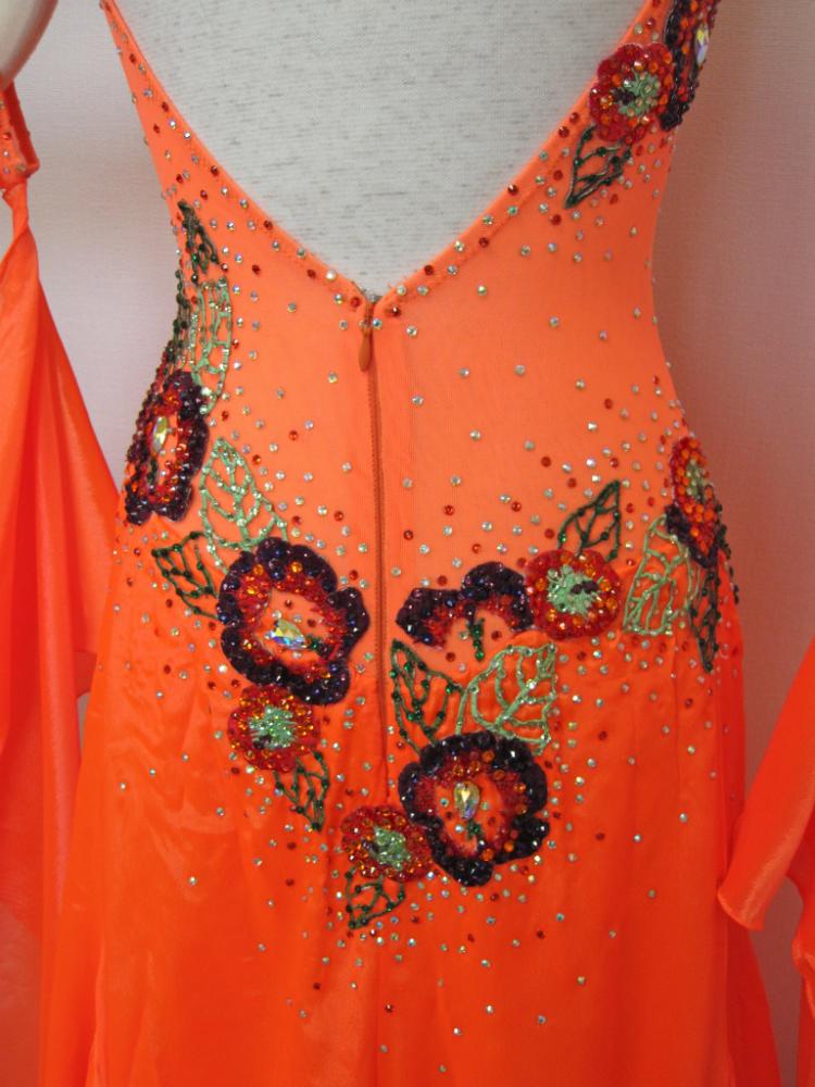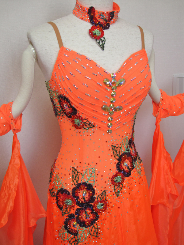 鮮やかなオレンジに紫とオレンジのグラデーションのモチーフがアクセントになっているドレスです。生地はクリスアンのサテンシフォンが使われています。石はよく輝くガラス製ストーンととスワロフスキーのストーンが混ぜて使われています。
