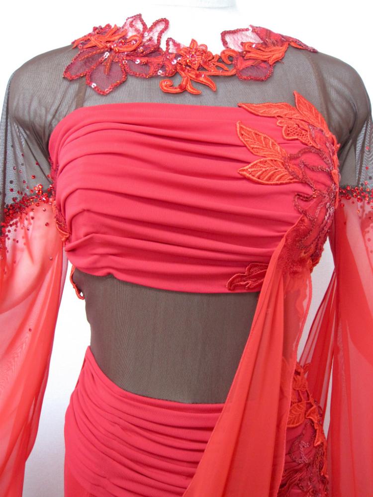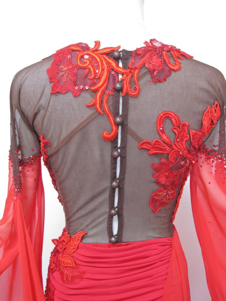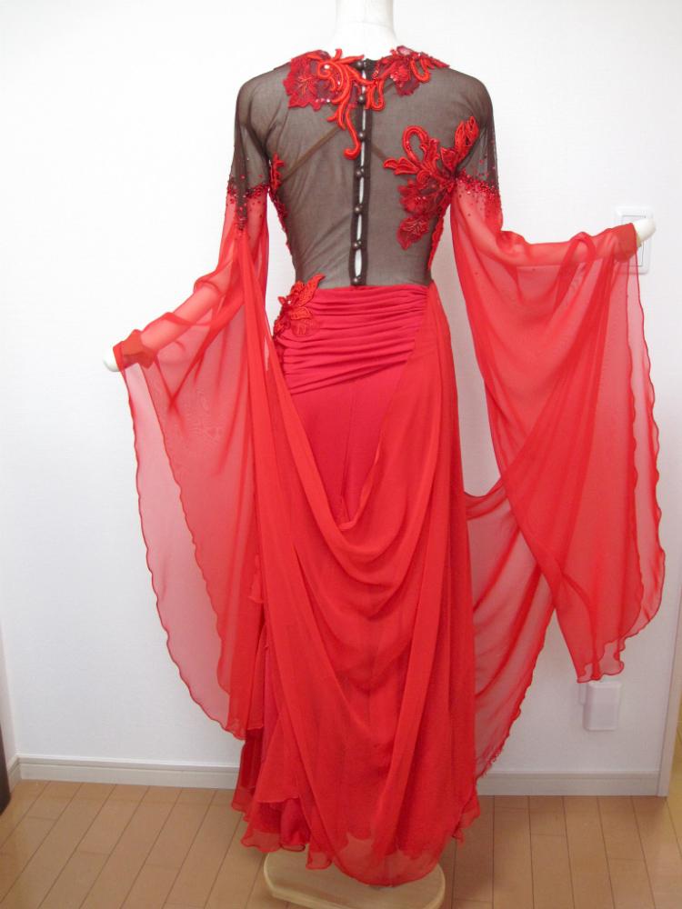 赤が際立つドレスです。背中のくるみボタンが特徴ある個性的なドレスです。オーガンジーのスカートをたっぷり使用していますのでよく踊ります。デモに最適なドレスです。