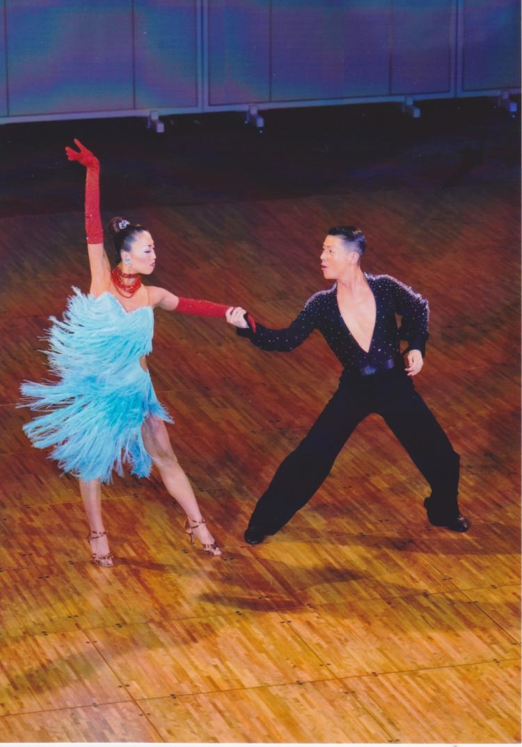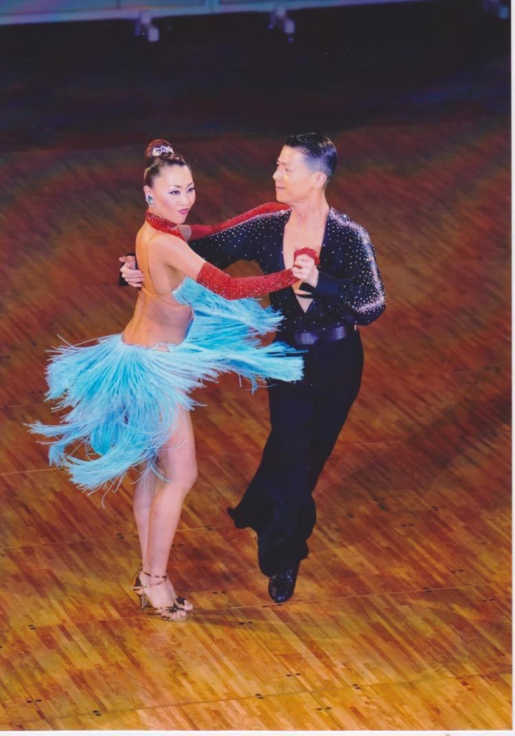 2008年に制作したロングフリンジドレスです。水色のながいフリンジがよく振れて動きを大きく見せます。赤の手袋とアクセサリーがドレスとのコントラストとなってフロアでよく映えます。