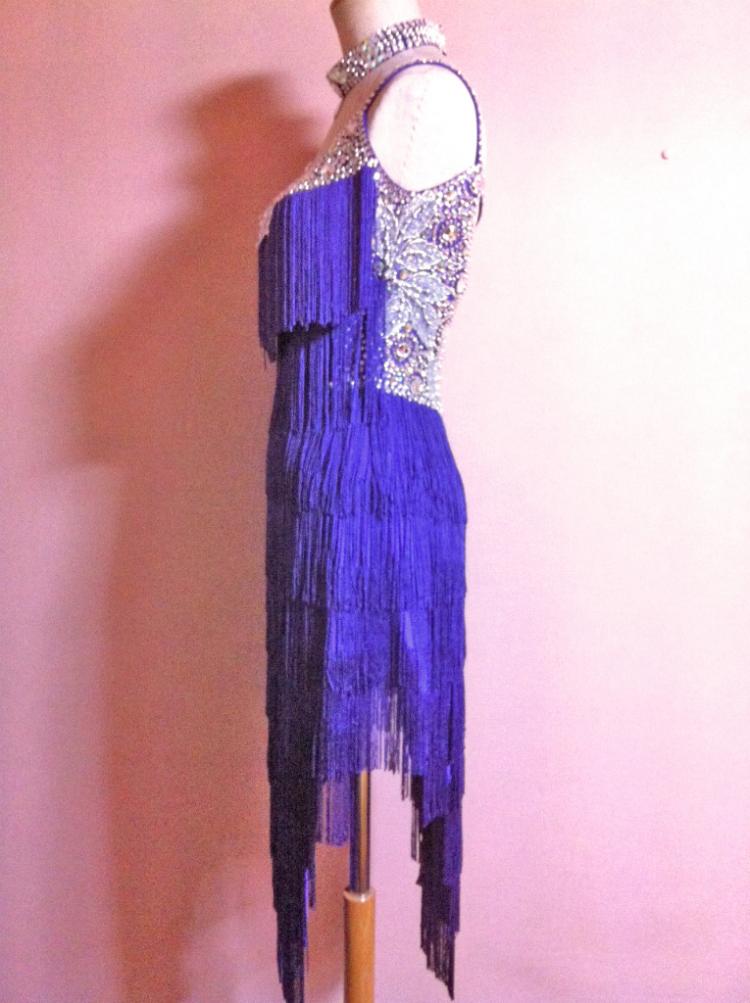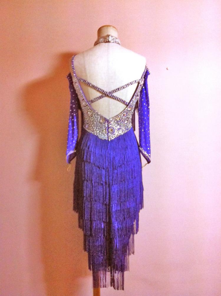 写真は青系に見えますが実物は紫色のドレスです。胸のところにシルバーのモチーフレースとスワロフスキーのクリスタルラインストーンをたくさん敷き詰めてありとても輝きます。チョーカー、手袋、ドレスカバー、予備用ストーンが付きます。