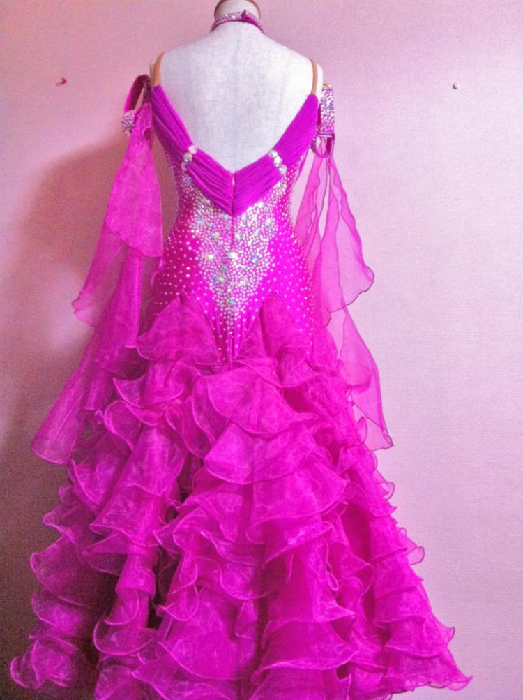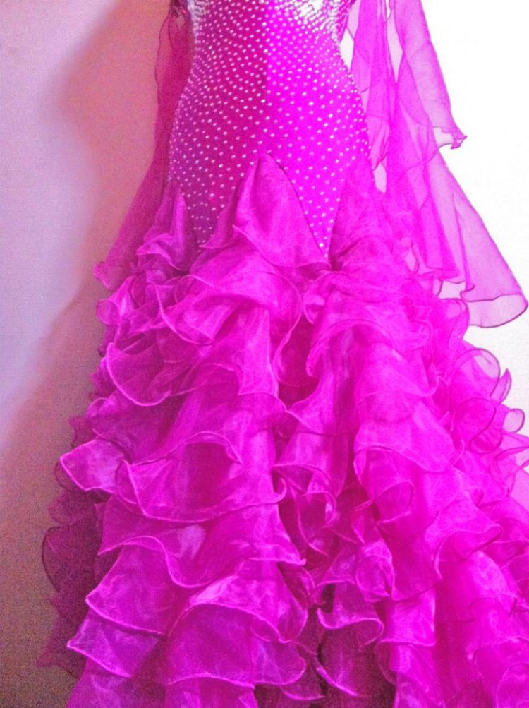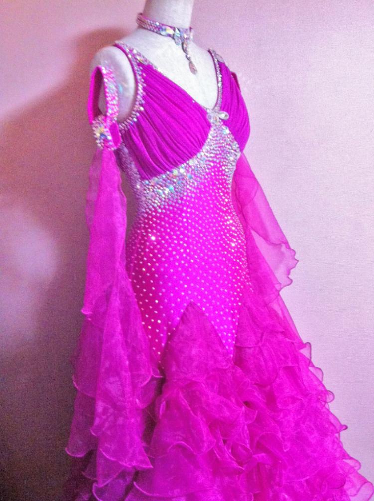 発色がとても素晴らしく鮮やかなドレスです。ボディにはびっしりとスワロフスキーラインストーンが敷き詰められ、スカートには全体的10段あり、ボリュームがたっぷりでとても足が長く見えます。
