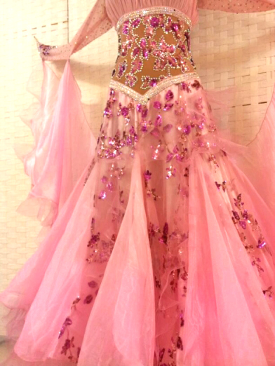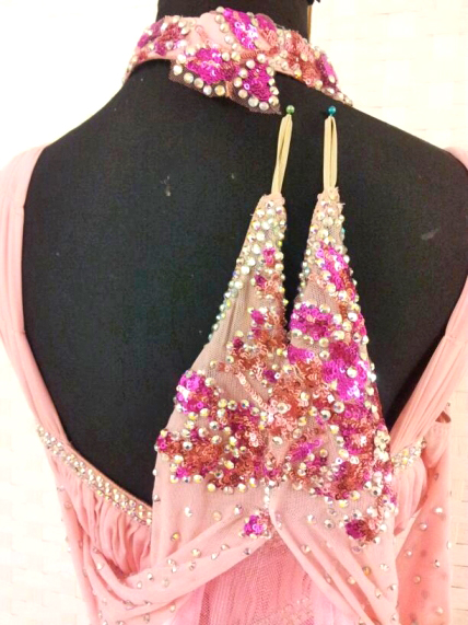 ピンクの可愛らしいドレスです。バストはギャザーが寄った布でふんわりとボリュームがあり、ウエストからヒップにかけてはベージュの布で引き締まって見えます。スパンコール花モチーフがたくさん散らされています。石はスワロフスキーではありませんがたくさん貼られています。