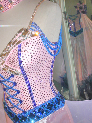 踊ると中から見えるスカートの2枚目にあしらった珍しいイタリア製シルクのバラ柄のプリント地が印象的なドレスです。ボディーにはスワロフスキーのストーンを約7000個、縫い付け石を約180個あしらってゴージャスで、キュートなドレスです。 スカートは一枚目と3枚目がサテンシフォン、2枚目がシルクプリント地、4枚目がオーガンジーで大変軽くよく踊ります。