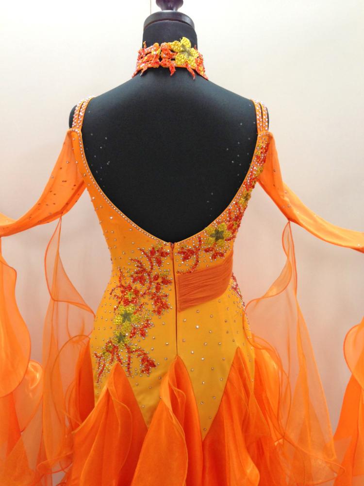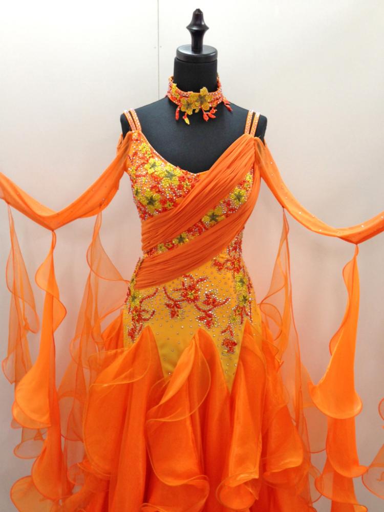 1回着用したのみ新品に近い、鮮やかなオレンジドレスです。クリーニングも済んでます。ドレスにはびっしりとスワロフスキーのストーンを使っています。