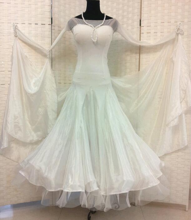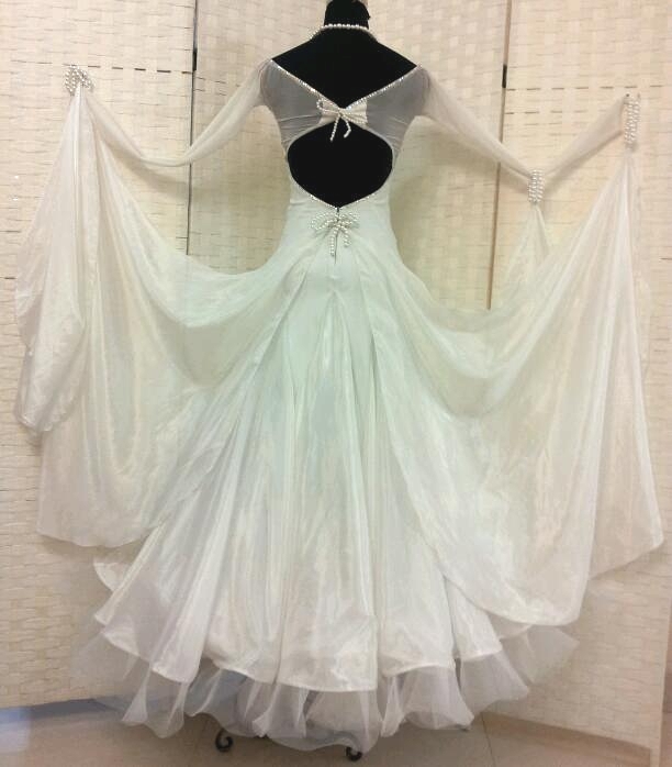 白の清楚なドレスです。胸元や背中、腕飾りはスワロフスキーのストーンやパールで飾られ、裾にはホースヘアが使われているのでよく舞います。シンプルながら存在感のあるドレスです。イギリスのクリスタルクローバーの生地が使われています。スカートがとてもよくひらひら動き、美しいです。