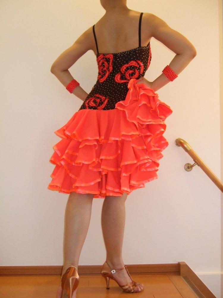 大きなバラの模様がインパクトのあるラテンドレスです。スカートにボリュームがありよく踊ります。
