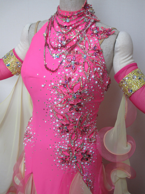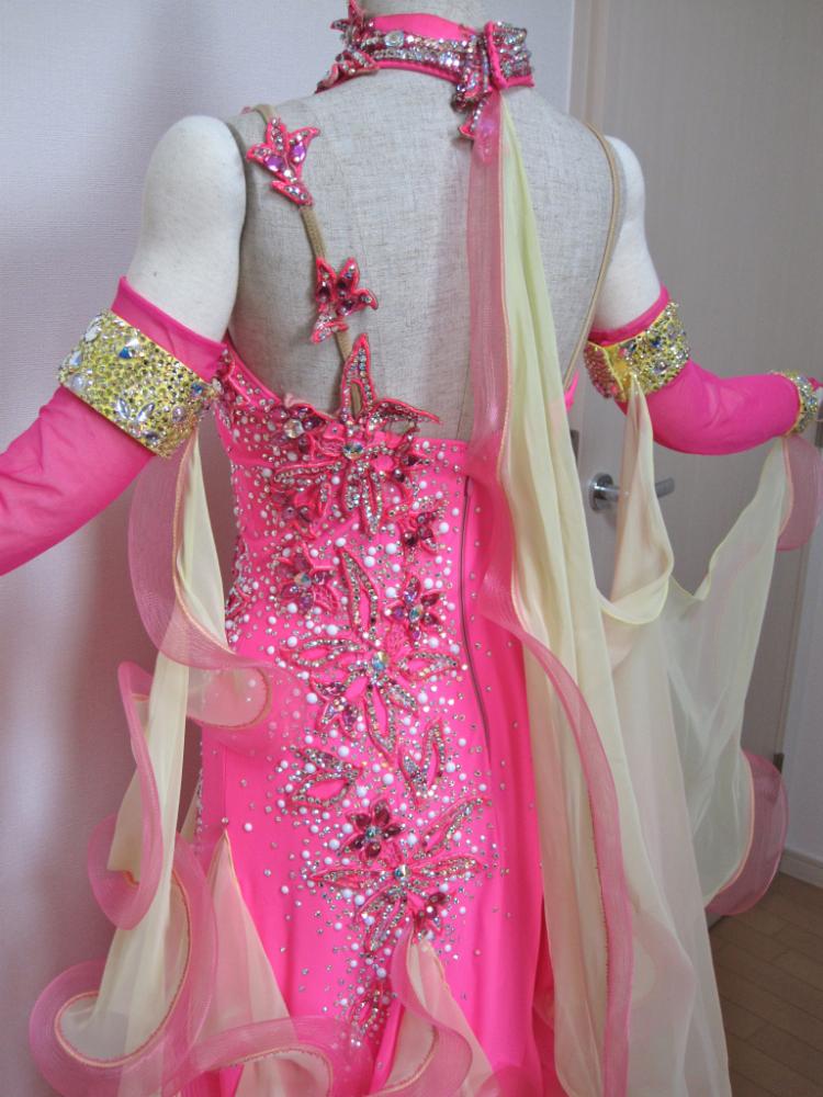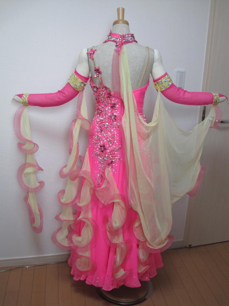 ピンクとクリーム色の配色はかわいいです。半年前にフラシとスカートをリフォームしました。背中は半分かくれます。付属品はアームカバーとグローブと髪飾り。購入時の価格43万円です。
