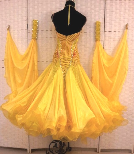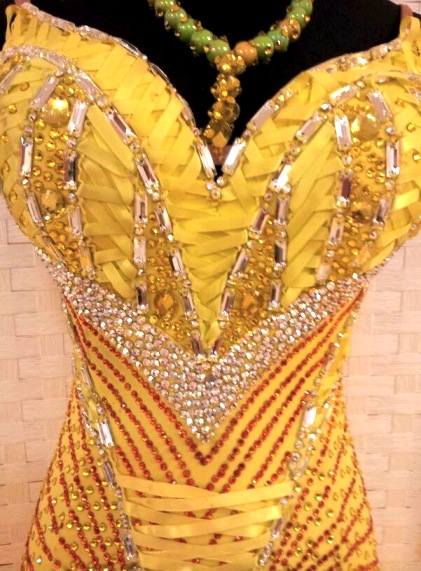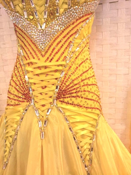鮮やかな黄色がフロアでよく映えます。ボディはたくさんのスワロフスキーストーンで飾られています。