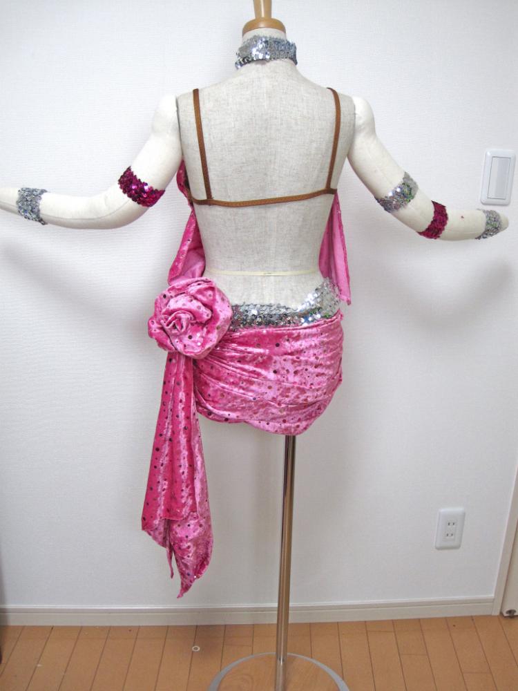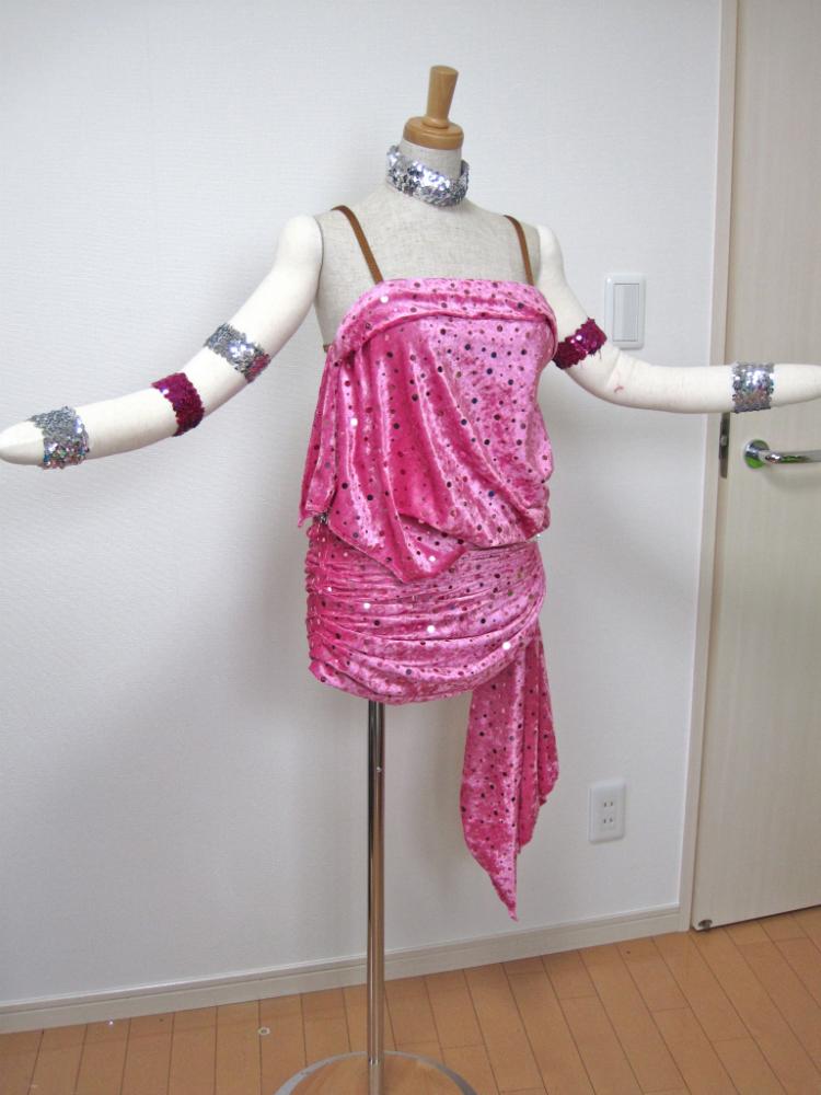 明るいピンクのかわいらしいドレスです。スパンコールでできたバングル附属。ヒップの立体花モチーフがポイントです。ボディには全体的にスパンコールが散らされています。