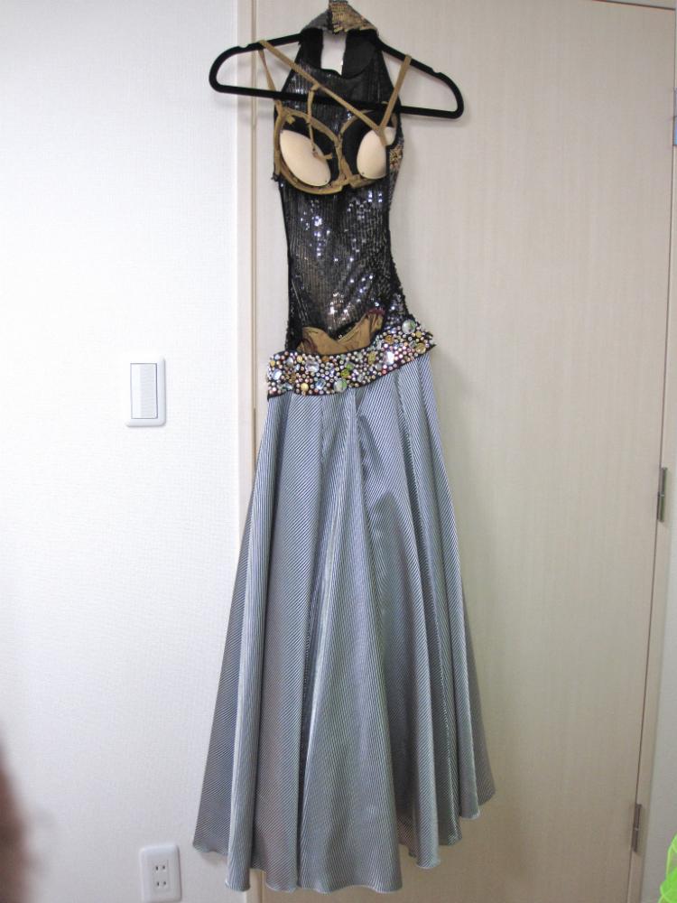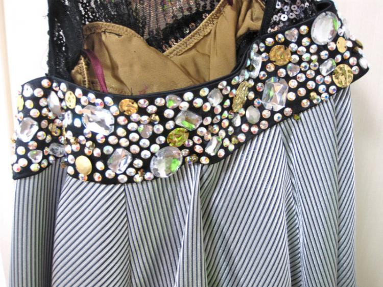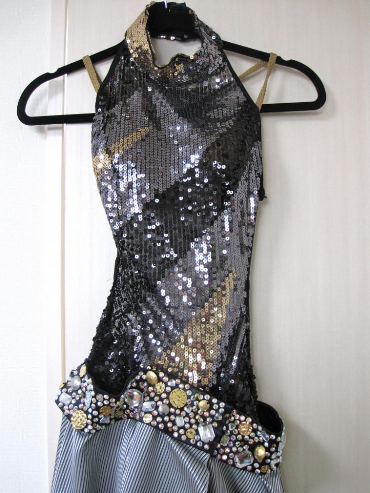 珍しいストライプ生地のパソドレスです。スパンコール生地のボディ部分はホルターネック型になっていて縦のラインを強調します。ベルト部分はストーンがびっしりです。
