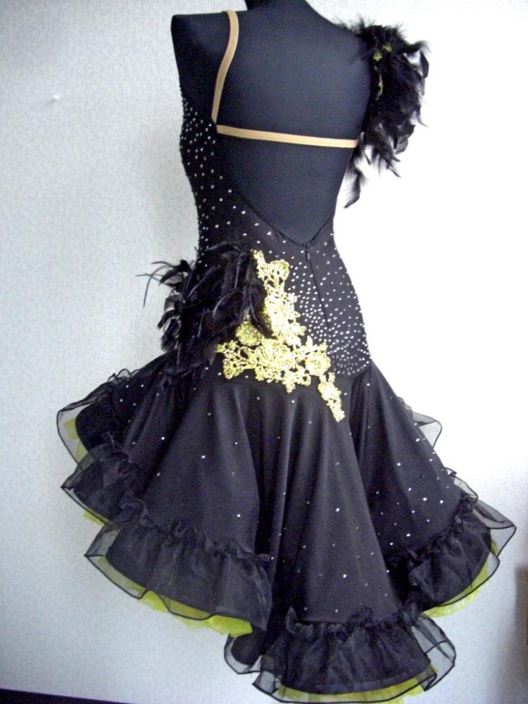 ライジングスターファイナリストのドレスをイメージしてオーダーしたドレスです。黒に黄色のインパクトが有り、スカートは後ろは長く、前が短く作ってありますので足が長く見えて可愛いドレスです。スカートにはより張りが出るようにオーガンジーでパニエを付けてあります。石はすべてスワロ・プレシオサのヘマタイトとジョンキルやシトリネがびっしり付けてあります。お写真に映っておりませんがヘアー飾りやドレスの飾り大きな羽のアクセサリーがつきます。
