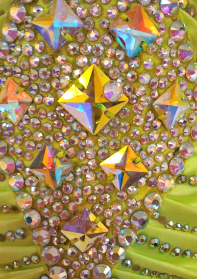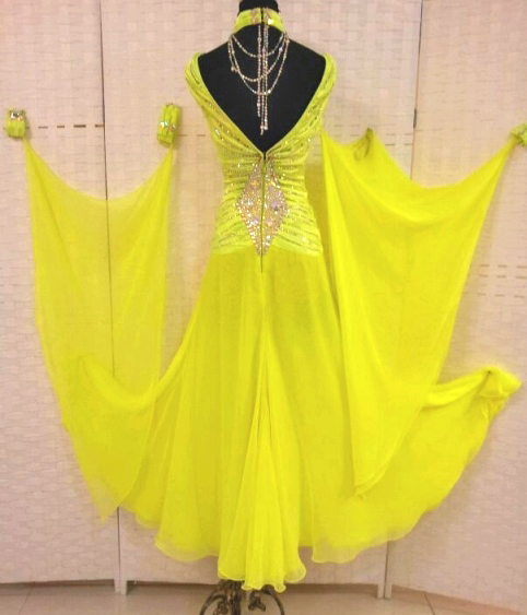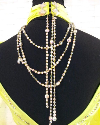 鮮やかな黄色のドレスです。ボディには前後に大きなダイヤの形が大量のスワロフスキーストーンが使われて描かれています。ネックレスのストーンのチェーンがきらびやかに光ります。