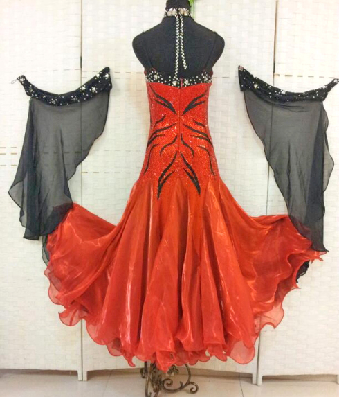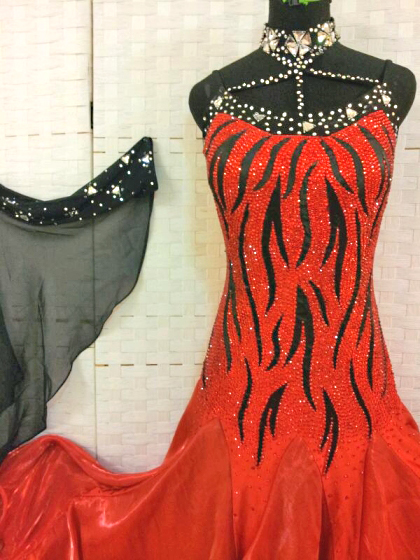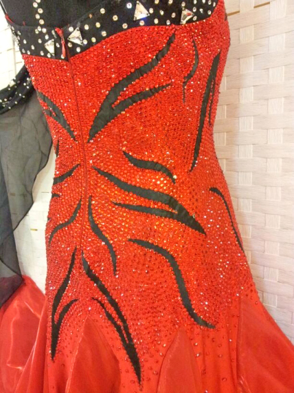 ボディは大量の赤のスワロフスキーのラインストーンで埋め尽くされていてとても豪華です。黒のラインがボディに模様を作っています。フロートやネックレスの黒がアクセントになっています。