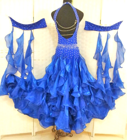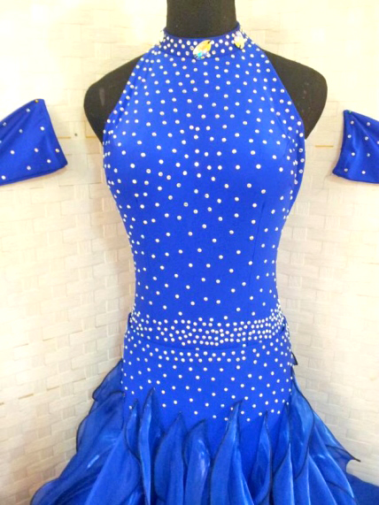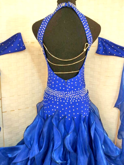 ロイヤルブルーのシンプルなドレスです。2ピース型でスカートは履くタイプになっています。クリスタルのストーンと光沢のある生地が使われています。