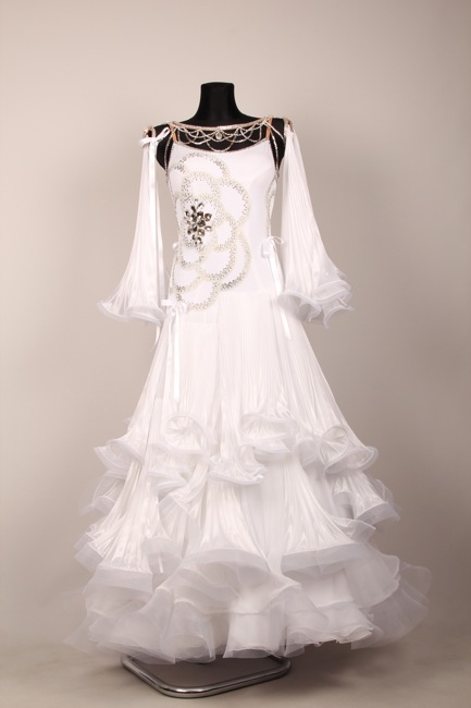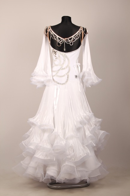 白のとても美しいドレスです。ボディにはラインストーンで大きな花柄が描かれています。花柄の中心部分は大きなラインストーンで豪華に飾られています。背中にはストーンで作られたチェーンが垂れて美しく光ります。