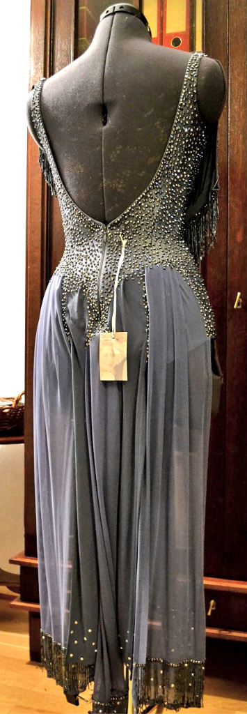 トップのドレープにはヘマタイト色の竹ビーズフリンジがびっしりと縫い付けられて