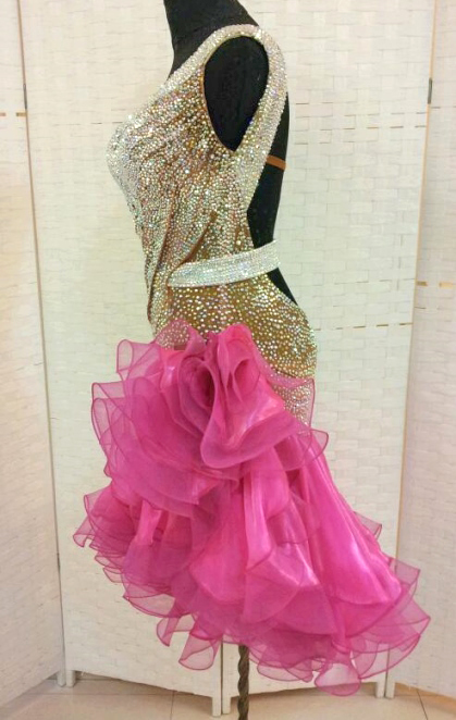 大量のスワロフスキーストーンが使われた豪華なドレスです。ボディやベルトは大小のスワロフスキーがびっしりと貼られています。
