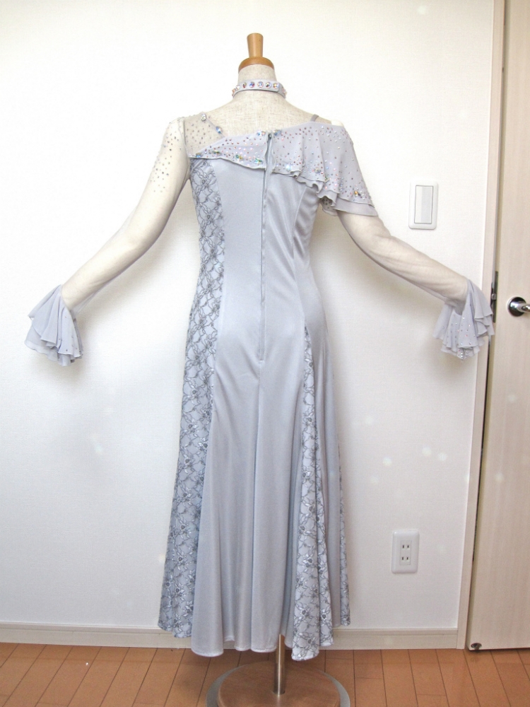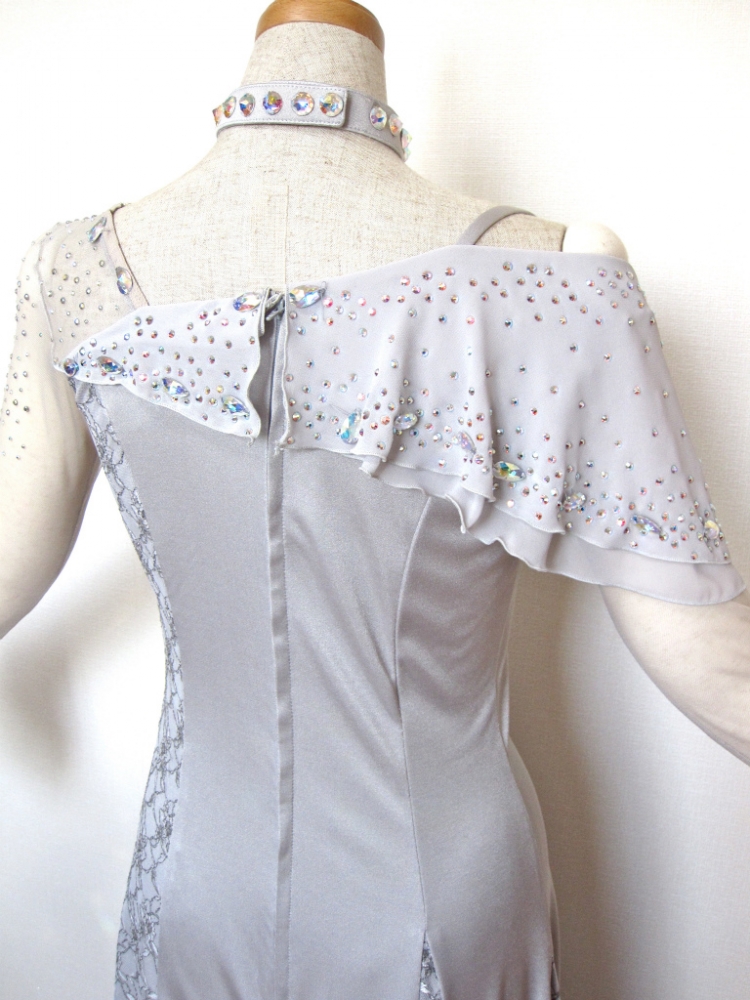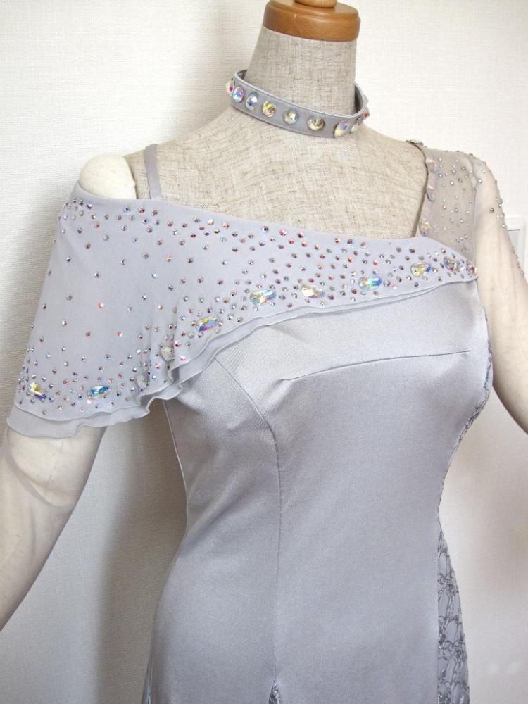 パーティなどにぴったりなシンプルなグレーのドレスです。胸元にかかっている布のななめのラインが美しいです。スカートのレース地への切り返しがアクセントになっています。