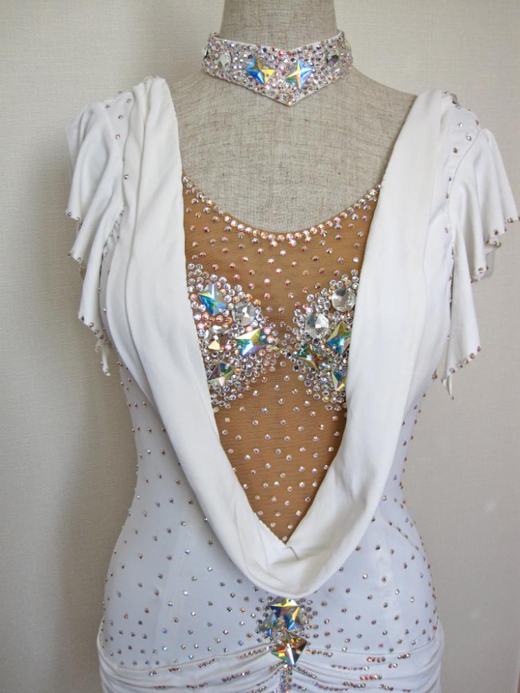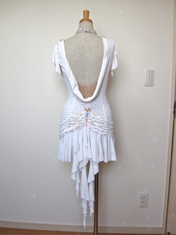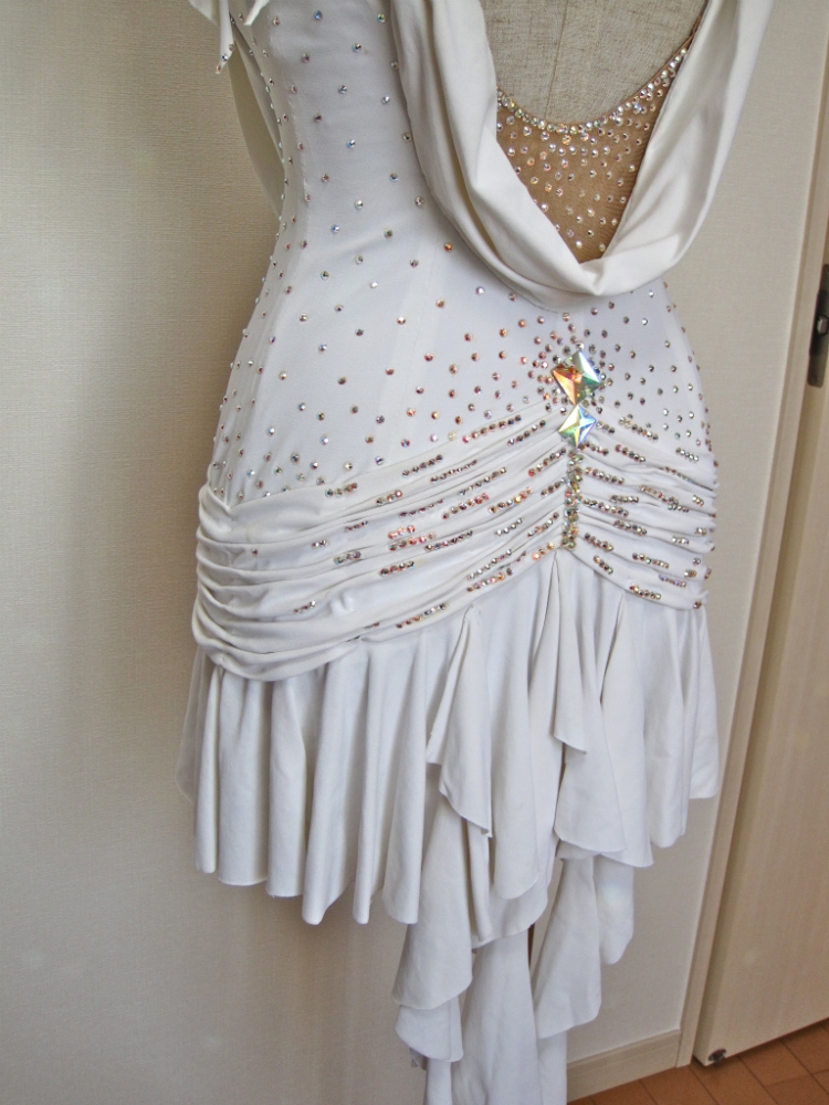 白のミニドレスです。ギャザーが寄ったヒップまわりその下のひだがたくさんのスカートがかわいらしいです。チョーカー、胸回りはラインストーンがびっしりです。