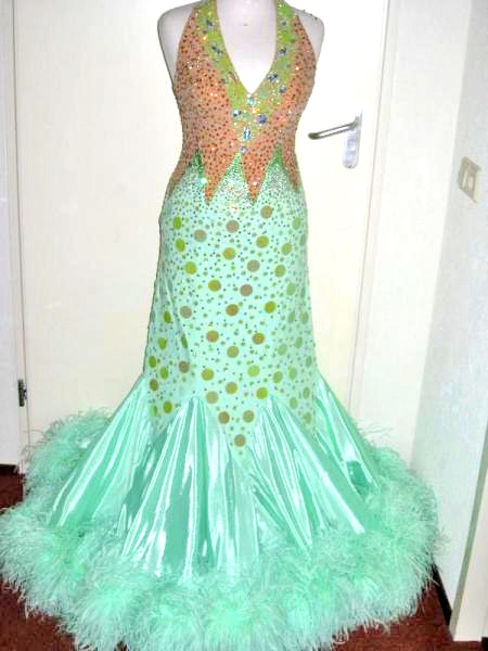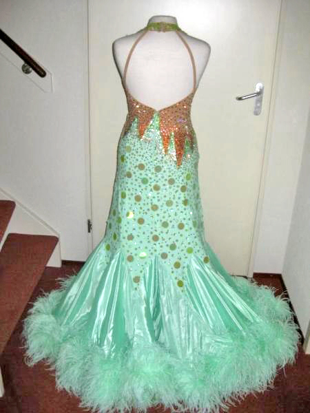 全身にラインストーンが散りばめられ、またスカートにつけられたスパンコールがよく光り、フロアで存在感を出します。クリーニング済。タンニングの後が目立つ箇所がありますのでお安くお譲りいたします。