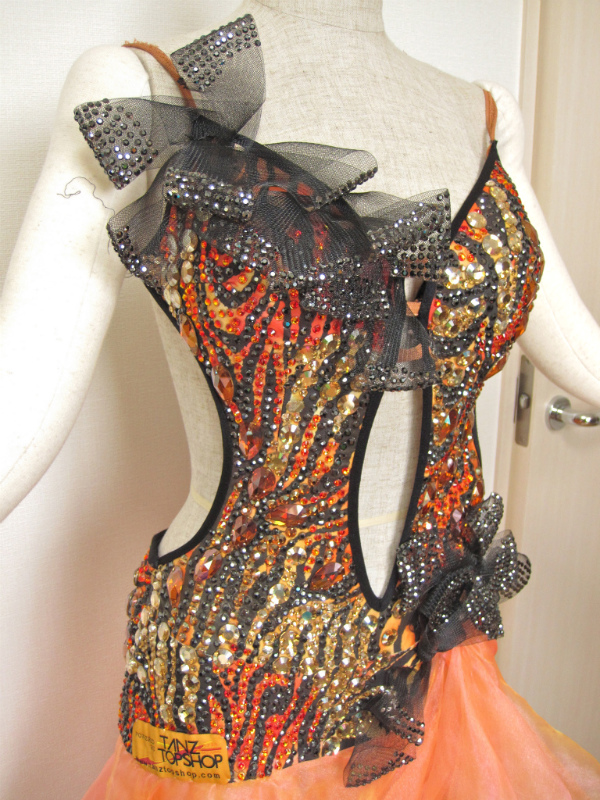 ボディ部分は黒とオレンジの柄の布で作られていて、柄にそって黒やゴールド、ファイアーオパール、オレンジ系の大きなスワロフスキーがぎっしりと隙間なく貼られてて非常に豪華。