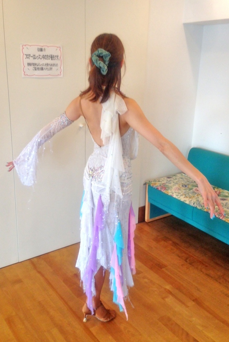 爽やかなホワイトの生地に水色、パープルのフリルがアクセントになっているドレスです。