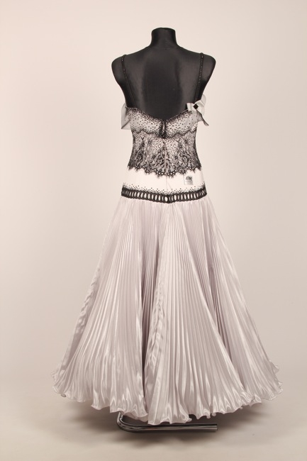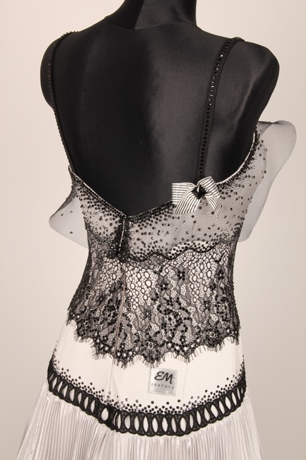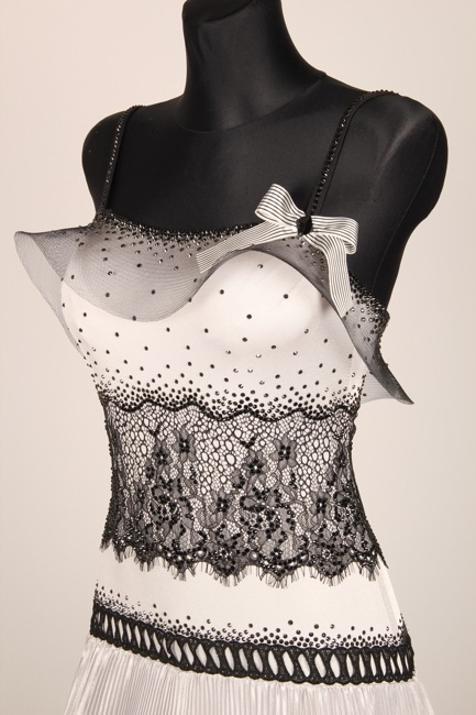 黒の上品なレースが美しい白のドレスです。胸のホースヘアが美しいラインを作っています。グローブ付き。