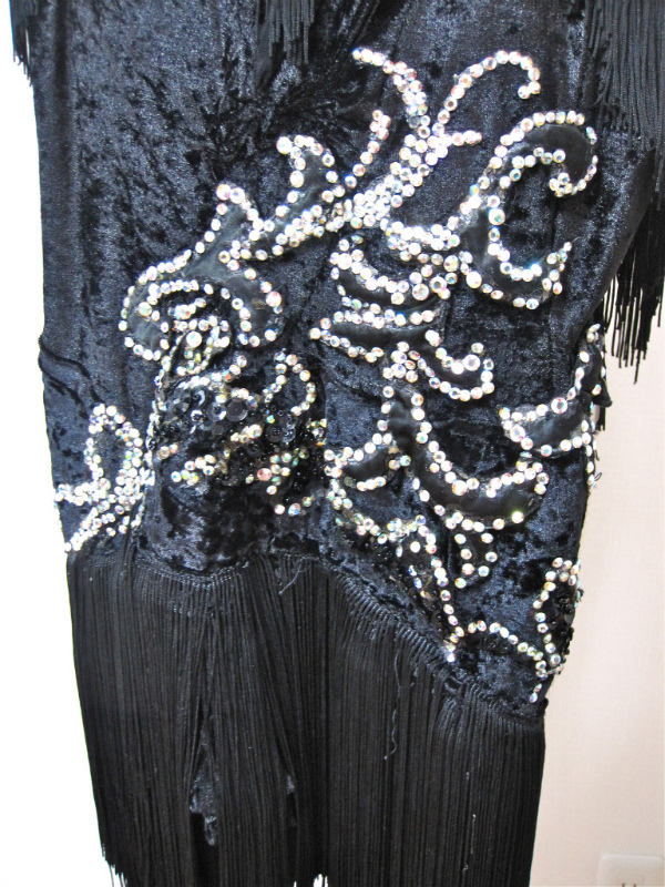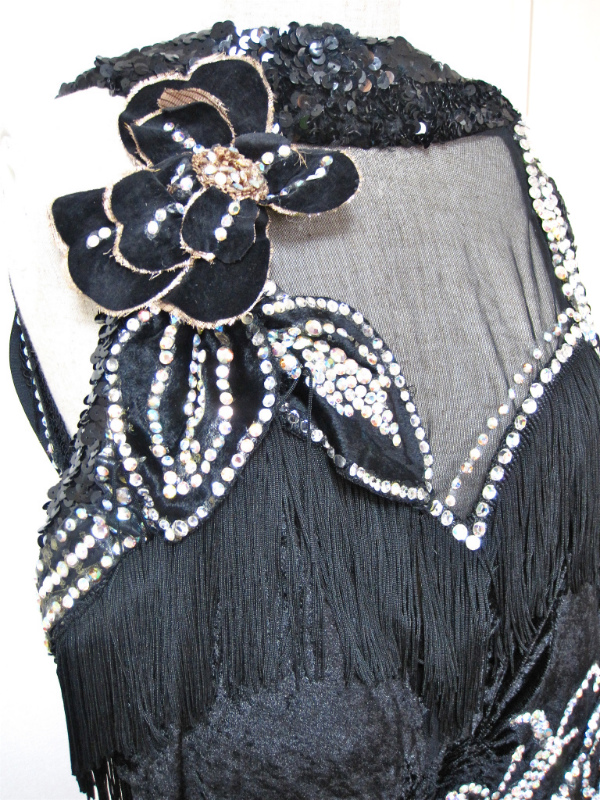 モチーフに貼られたストーンが美しく光ります。フリンジがよく踊ります。胸元の花がワンポイントです。