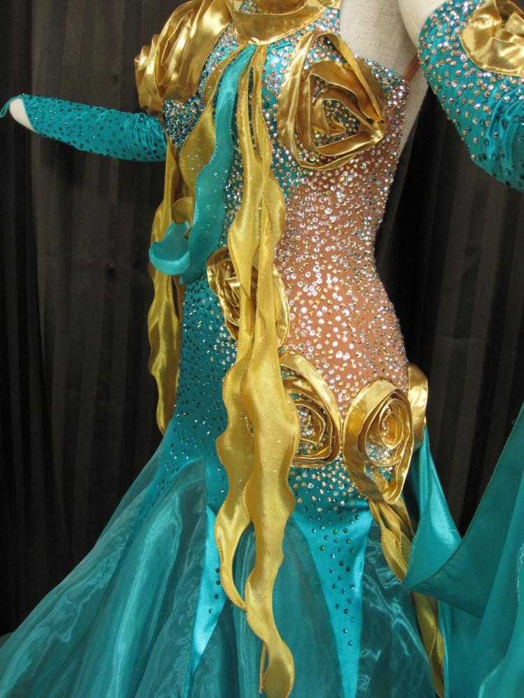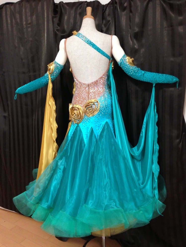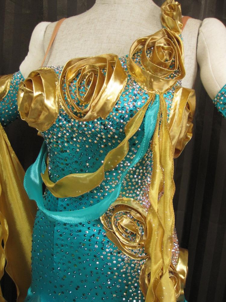 ジェイドにゴールドが映える印象的なドレスです。胸元とヒップの布で作られたバラが立体的でとても素敵です。ボディには石が沢山使われてまばゆいほどに光ります。サイドやバックにはスキンカラーが使われているので、ラテンドレスのようなスタイリッシュなデザインとなっています。