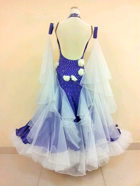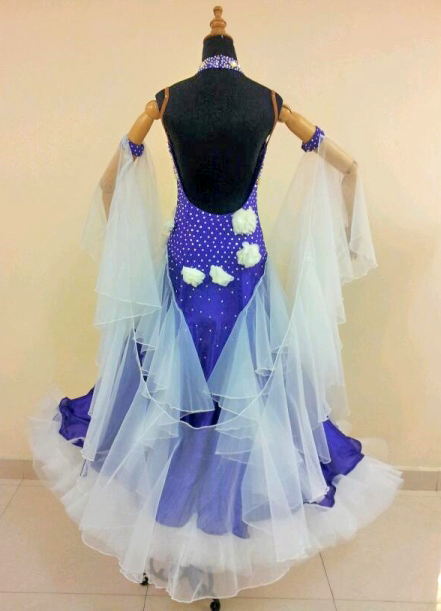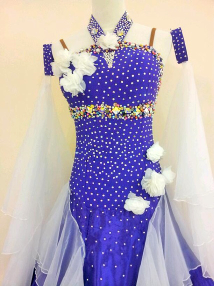 美しい紫の生地にホワイトのフロート、インナースカート、立体モチーフのコントラストが美しいドレスです。背が高く見えるハイウエストラインにスワロフスキーのストーンがびっしり貼られています。