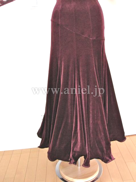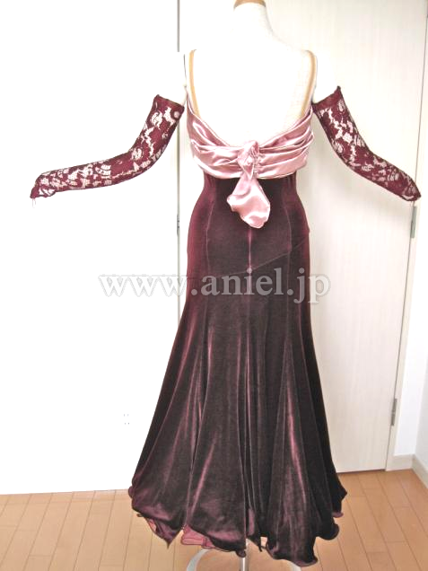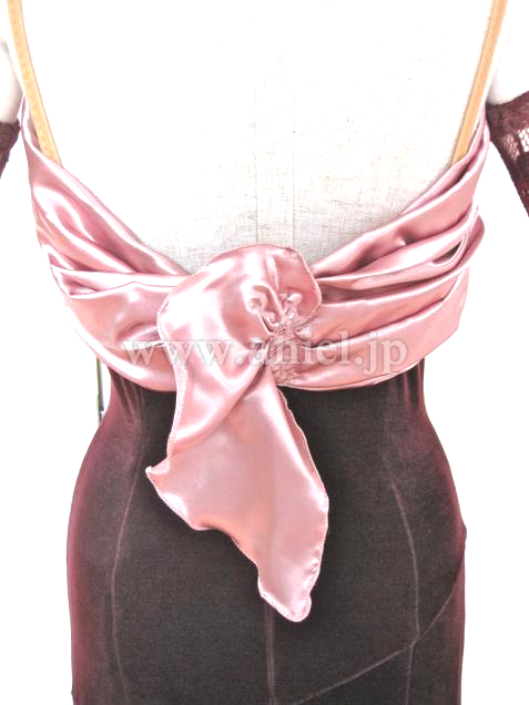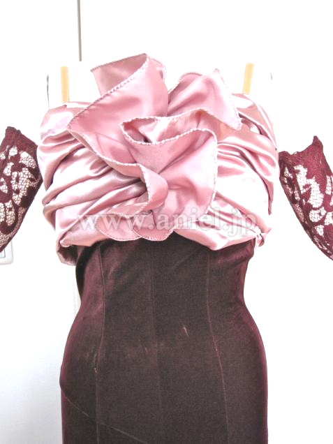ドレスのバストは安定性のよいしっかりとしたパッドがはいっており、たっぷりとしたサテンとあいまってバストをきれいにみせてくれます。ここから腰のラインがなだらかにスカートにつながり、ベロアの艶が生かされています。