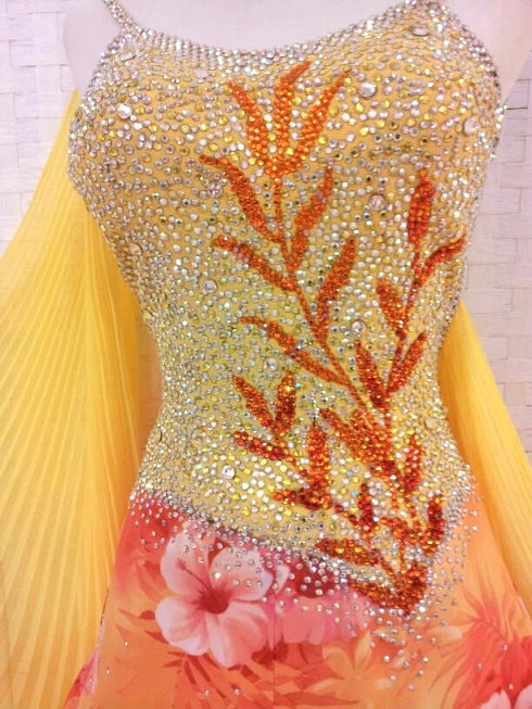 黄色のボディ、フロートにクリスアンのオレンジの柄布がスカートに使われたドレスです。