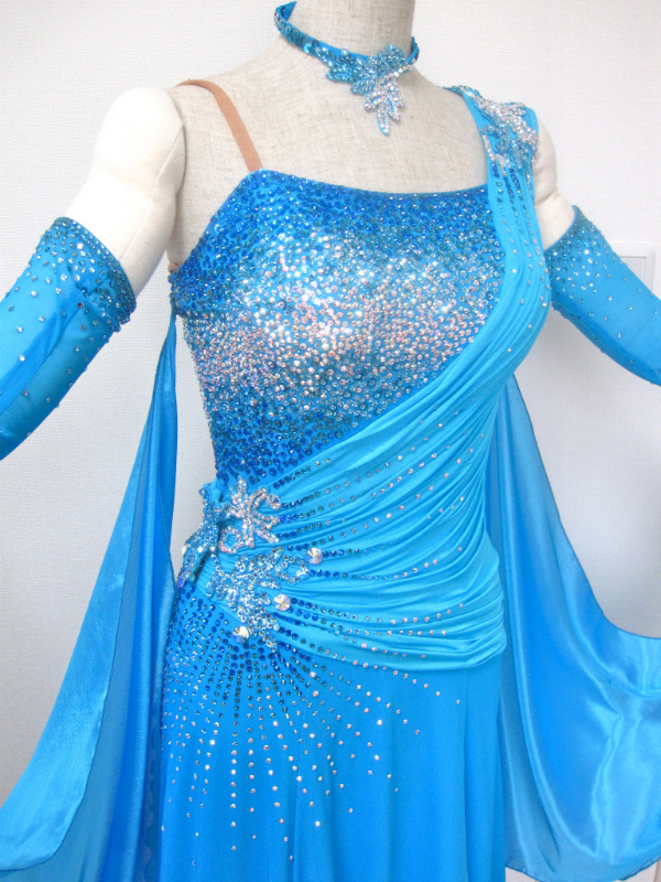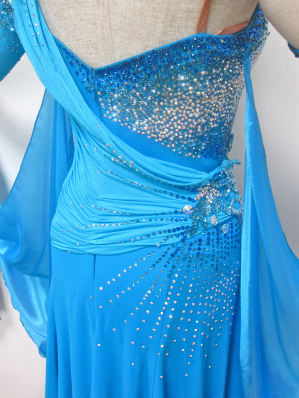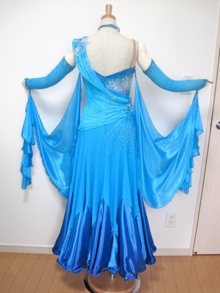 チャコットの高級ブランド『凛舞』の上品でゴージャスなドレスです。定価65万円でした。スワロフスキーとサテンが大変美しく、ライトニングの中での輝きは観客からいつも歓声があがりました。スカートの裾にテグスが入っていますので綺麗に舞ってくれます。