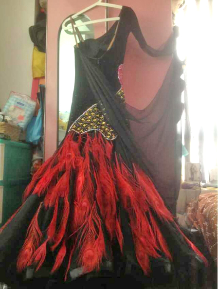ドレス全体に大きく一羽の火の鳥がスワロフスキーのストーンで描かれたインパクト大の個性的なドレスです。孔雀の身体はびっしりと貼られたストーンで力強く表現されています。尾の部分は本物の赤い羽根がたくさん使われとてもゴージャスです。スカートはボリュームたっぷりでよく舞います