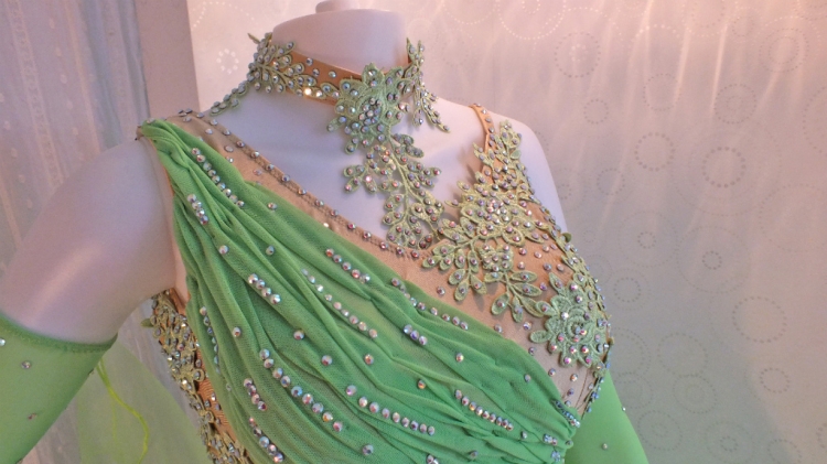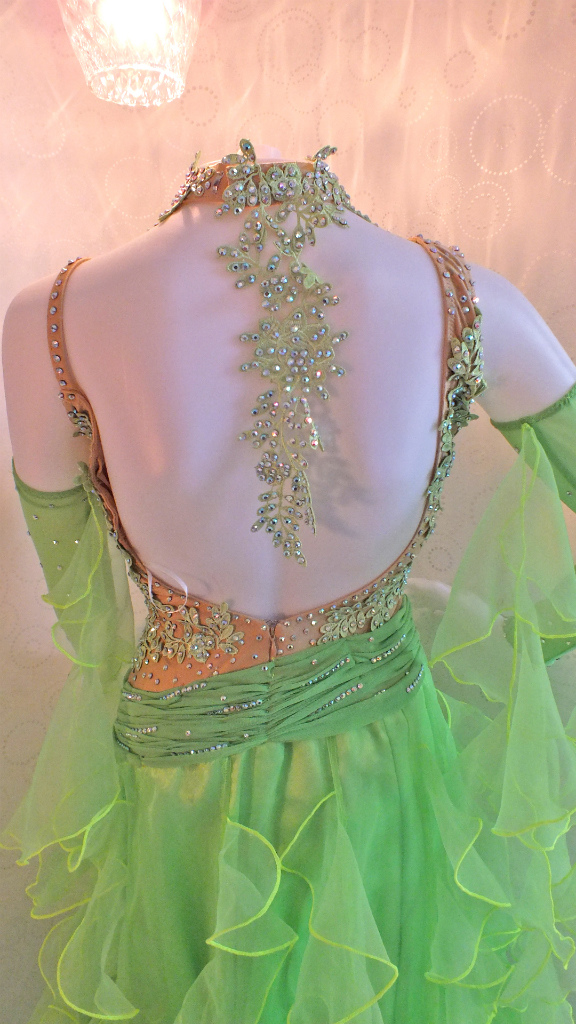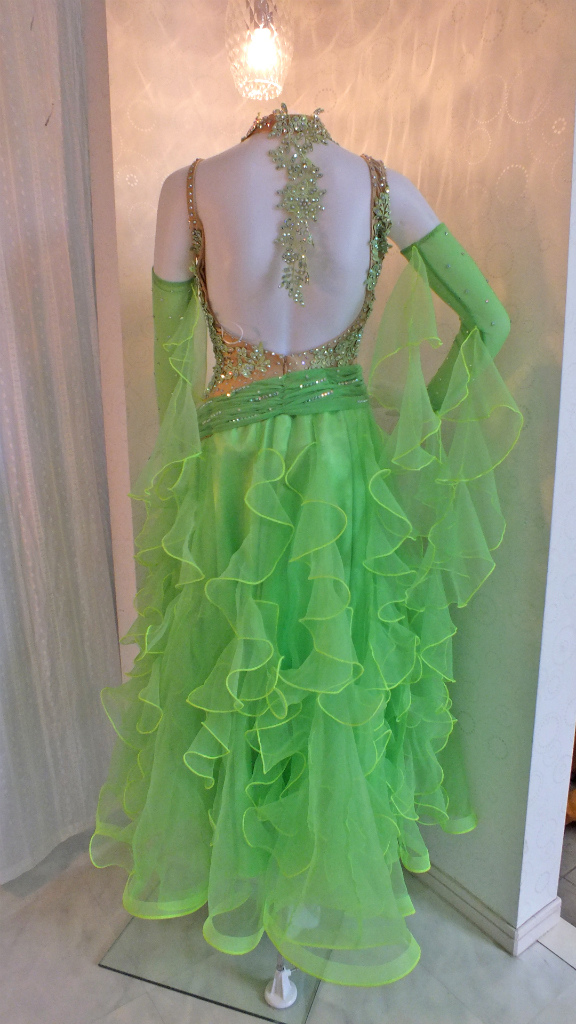 プロの先生ご使用の品です。チョーカー付き。 使用回数は1回のみ。 石は落ちていません。かなりの美品です。 新緑色の明るいグリーン。 スカート部分にはたくさんのフリルが付いています。