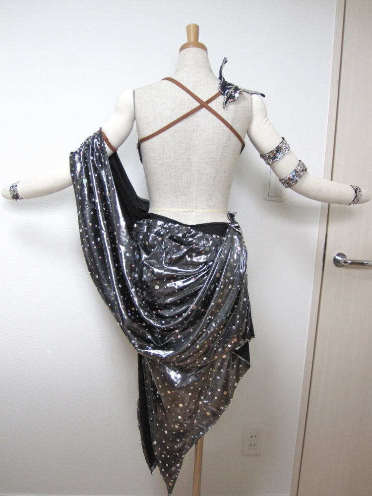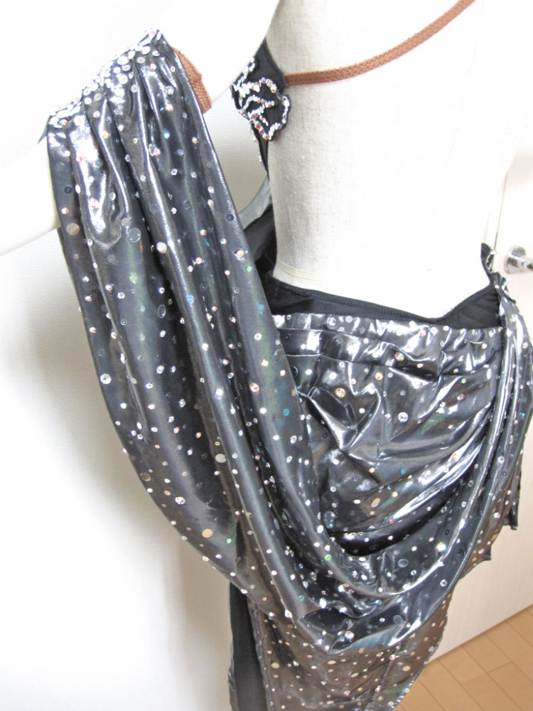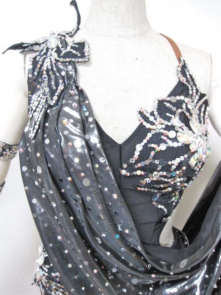 ドレープが身体のラインを美しく見せてくれます。ドレープ全体とモチーフにスパンコールとラインストーンがたくさん散りばめられています。