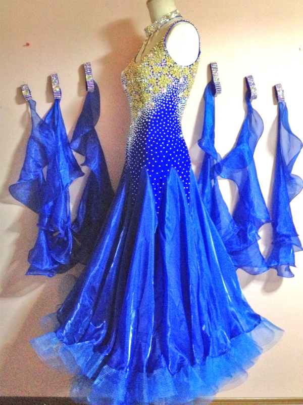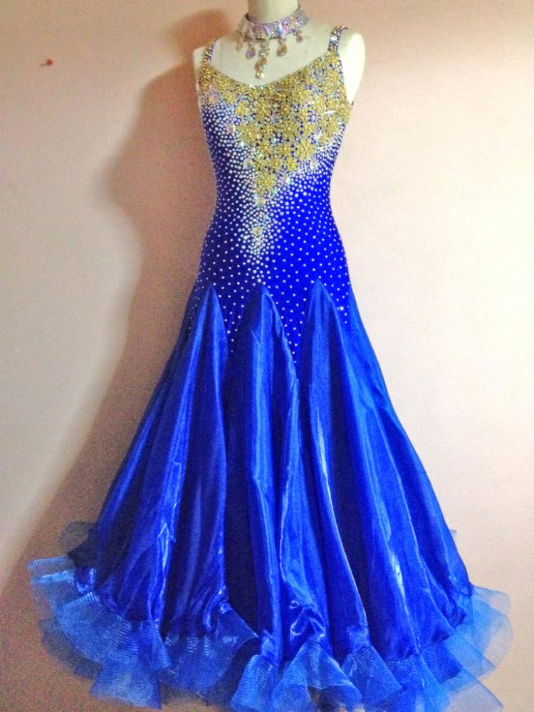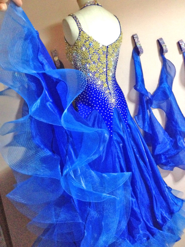 ロイヤルブルーのドレスにゴールドのモチーフがよく映えるドレスです。ストーンがたくさん貼られています。スカートの裾にはホースヘアがつけられよく舞います。