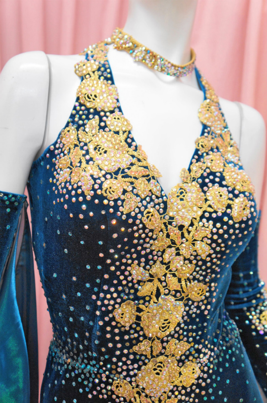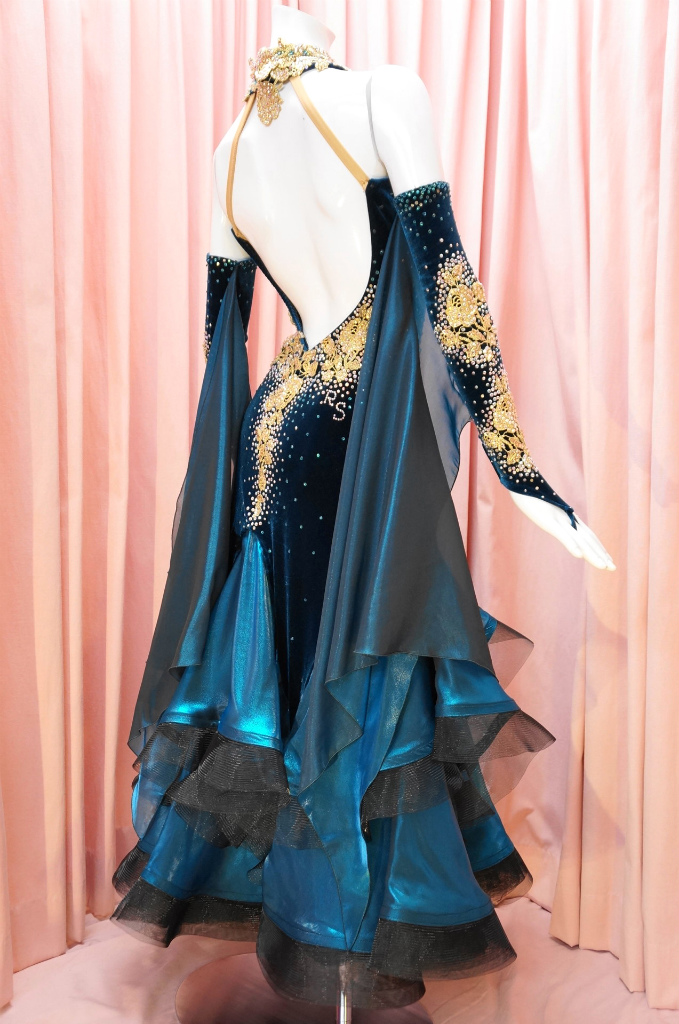 ボディ部分には深いグリーンのベルベットを使用。スカートには同色のオーガンジーが使われていて、10cm幅のブラックのホースヘアが付いています。珍しい色合いで、スカートもとても良く動きますので、競技会のフロアなどでも大変良く目立ち、勝てるドレスです。多少着用感はありますが、クリーニング済、ストーンメンテナンス済で綺麗な状態です。髪飾り・イヤリング・ハンガー・ドレスバッグ付です。
