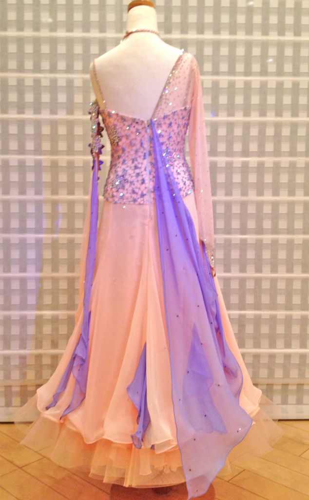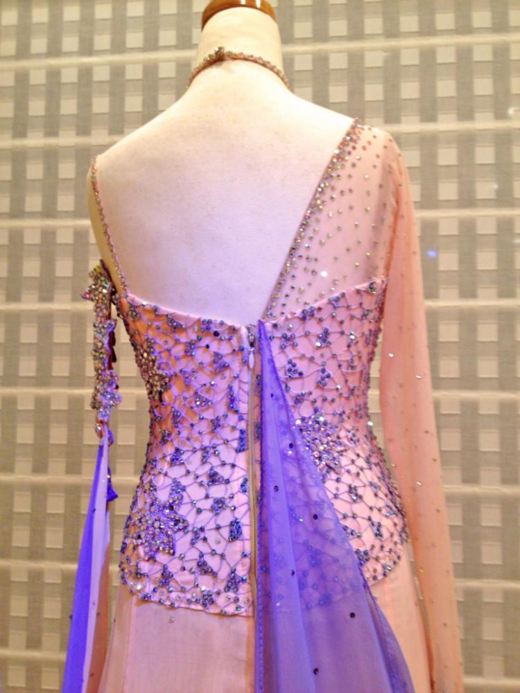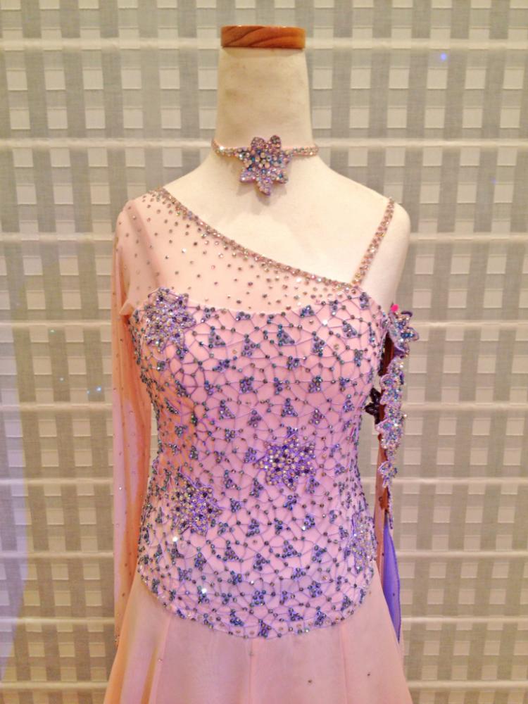 裾にはホースヘアーがつけられよく舞います。購入後スワロフスキー800個追加、スカートは5枚重ねの良質なドレスです。ネックレス付属。