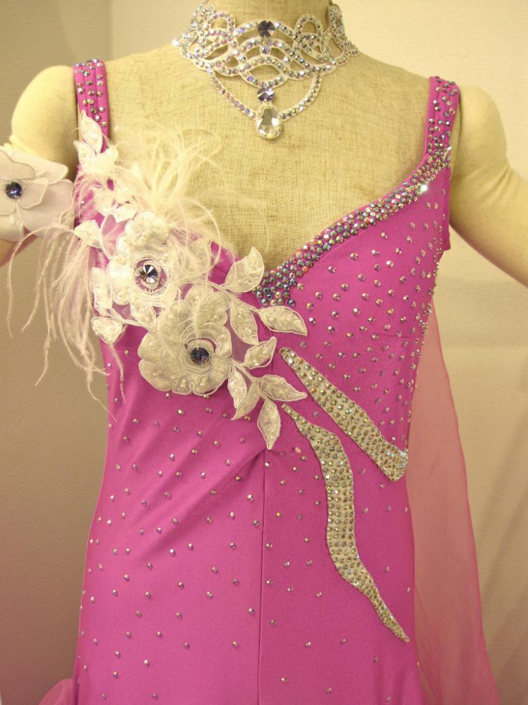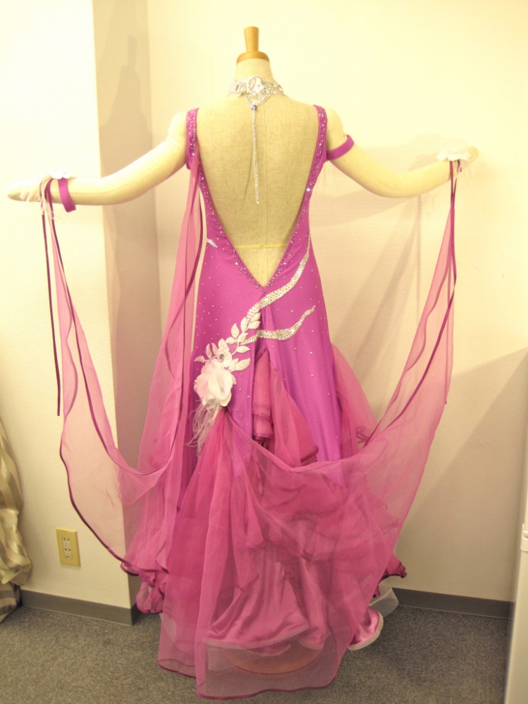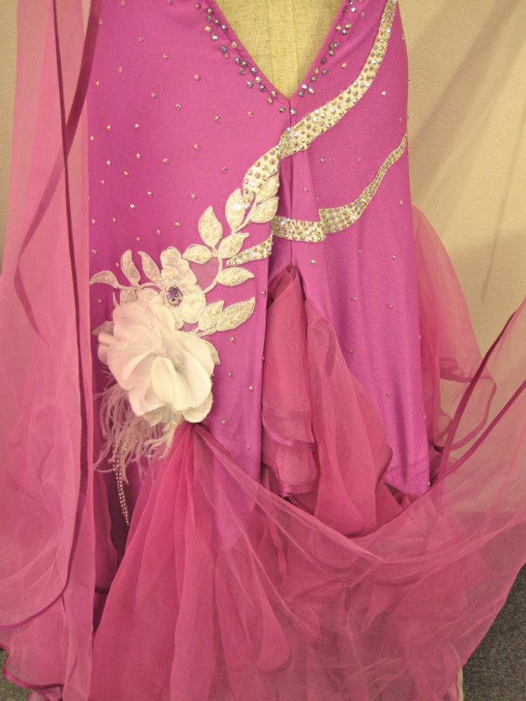 紫に白のモチーフが可愛らしいドレスです。スカートの形が個性的です。フロートは大きめで今流行りのリボンフロートもつけられています。