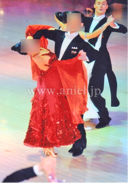 シンプルですが上半身やスカート部分が全てスパンコールがついているのでとても目立ちます。スカートもフリルがついているので、よく舞うコンペ向きのドレスです。