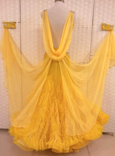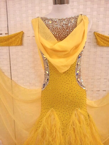 スカートに黄色の羽根がたっぷり使われたゴージャスなドレスです。ボディはたっぷりのスワロフスキーストーンで飾られています。クリスアンの生地が使われています。