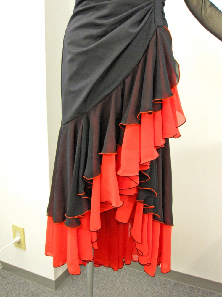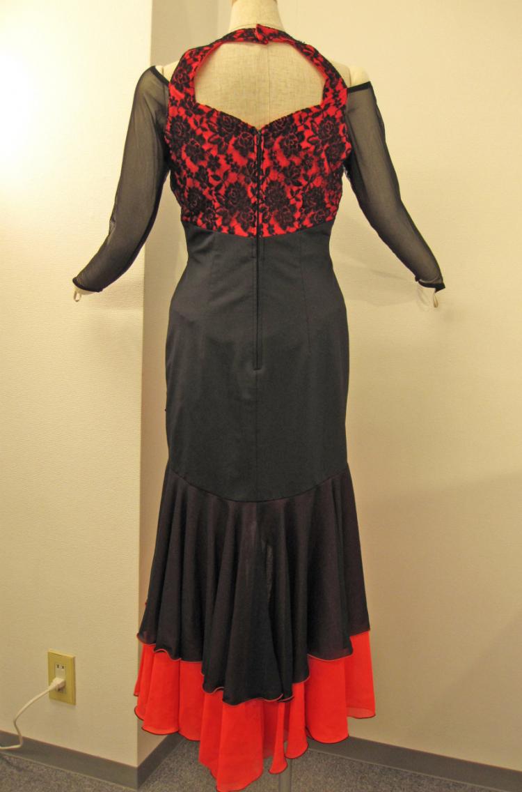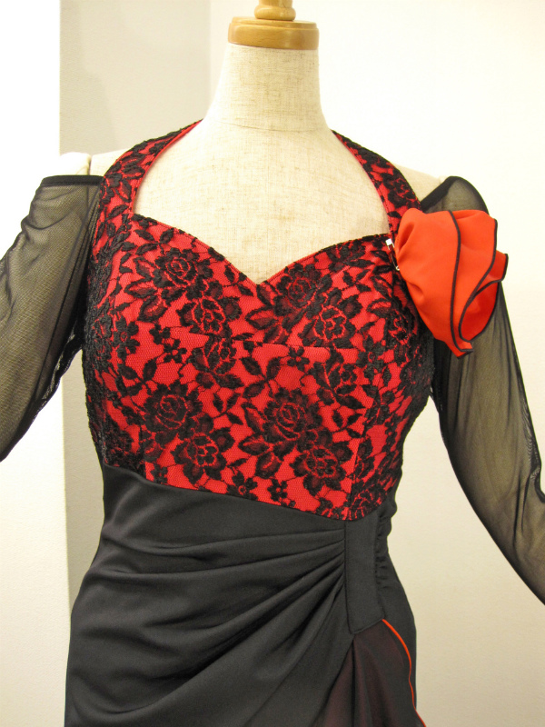 赤×黒でパソやタンゴにもぴったりです。袖がメッシュになっているため、あまり露出したくない方にもおすすめです。付属品はコサージュです。