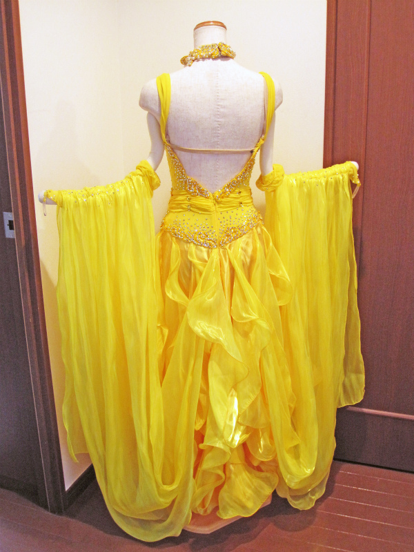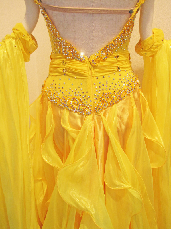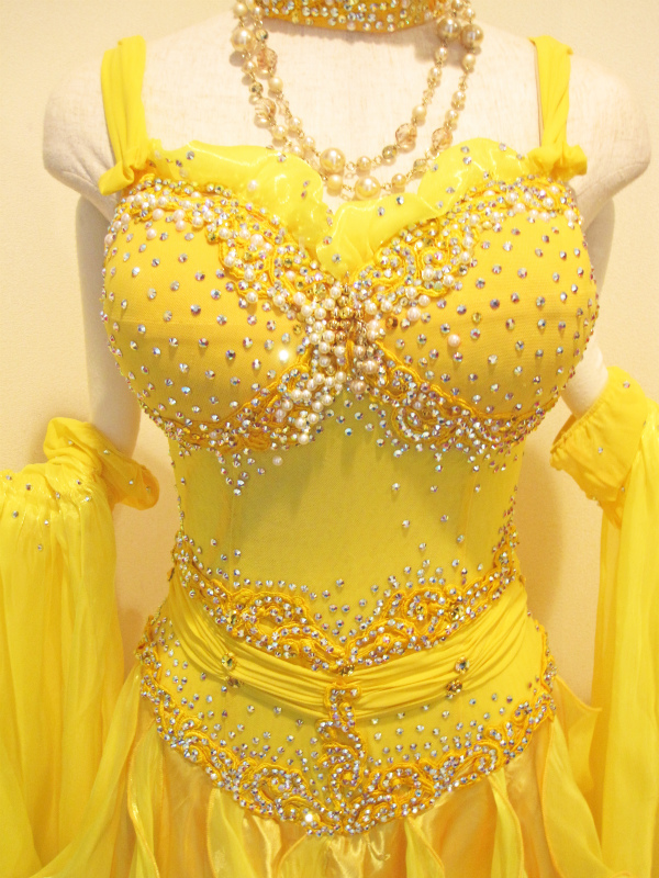 スワロフスキーのストーンを追加しています。きれいな黄色で競技会場ではよく目立ちます。胸元のフリルとバールがとてもかわいいです。チョーカーは付属しません。