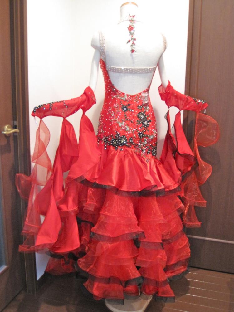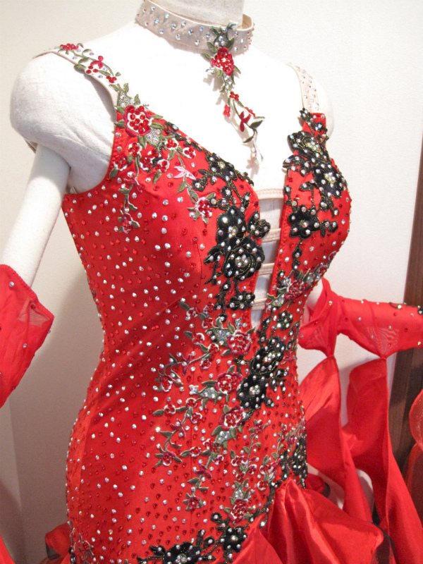Michelle dressのセミオーダードレスです。石はスワロフスキーを20グロス使っていてとてもよく光ります。スカートはヒップの斜めの切り返しから段々フリルになっていてボリュームがありよく踊ります。インナースカートに一部破れがあり、直してありますのでお安くお譲りいたします。外から見た分には全くわかりません。