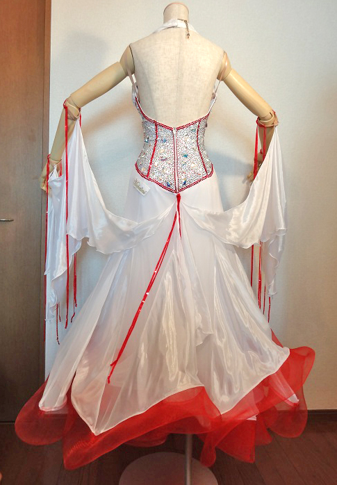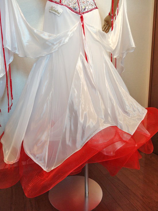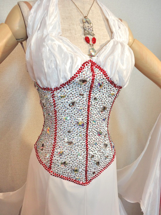 アトリエミケリーニの白ドレス。新品です。白地に赤のアクセントが可愛らしいです。ホルターネック型になっていますが、ソフトなので首を締め付けることはありません。ホースヘアのラインが波型で面白い裁断になっています。コルセットタイプなので細身に見えます。通常は30万円を超えるドレスですが、店舗オープンの価格でご提供いたします。