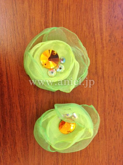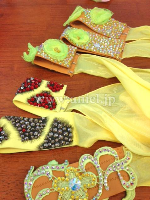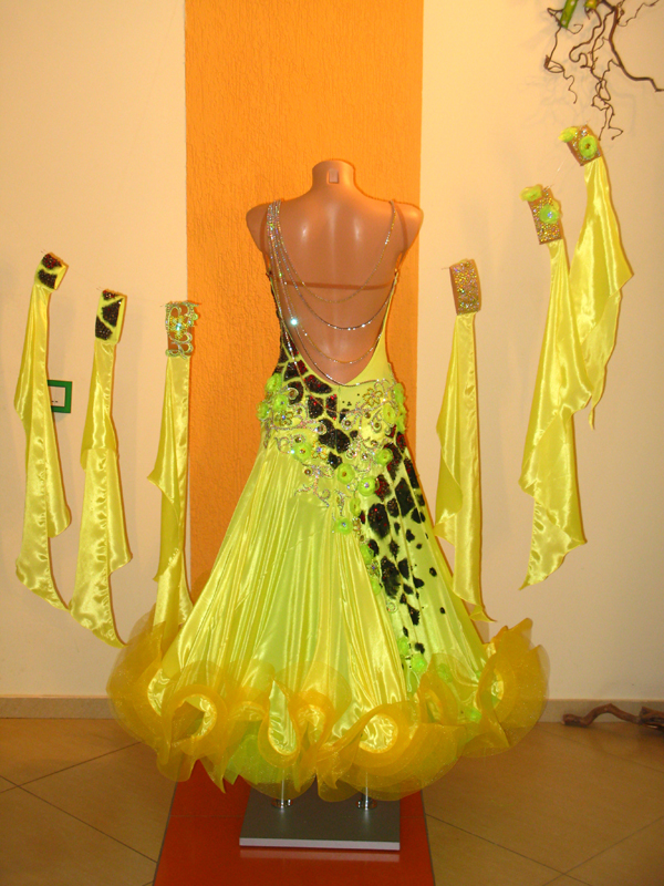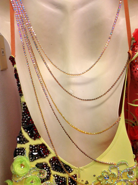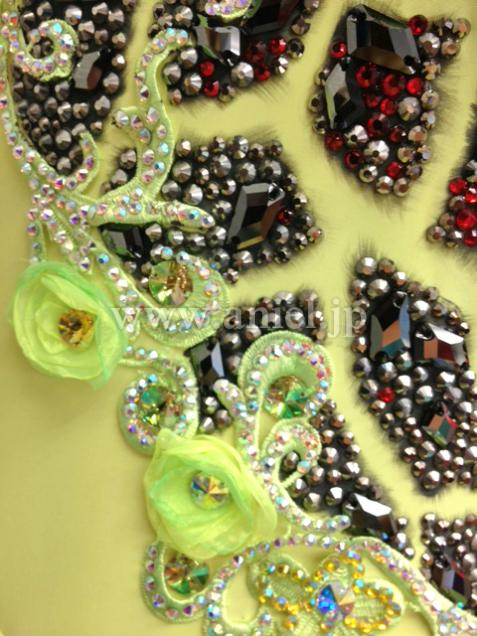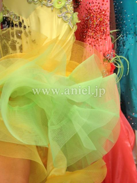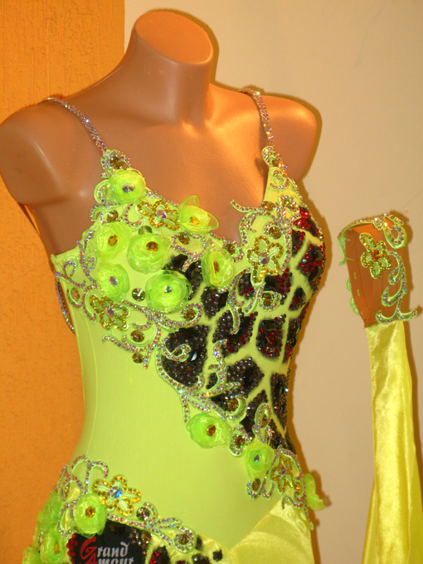 Grand Amourの新品ドレスです。ジラフの模様はペイントで描かれており、すの上にスワロでデコレーションされています。アンダースカートはライムグリーンの明るい発色のオーガンザが使われています。シャーリングと外向けについたホースヘアが可愛らしいです。背中や腕輪のスワロがとてもゴージャスです。ボディと同じお花のイヤリングが付いています。
