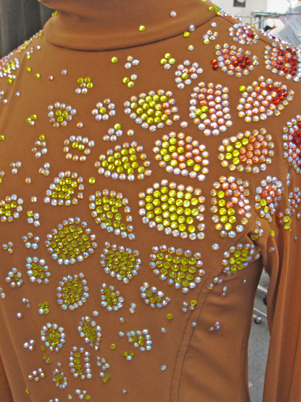 ヌードカラーに黄色、オレンジ、赤の石で装飾がされているラテンシャツです。※写真は女性用のトルソーに着せて撮影しています。