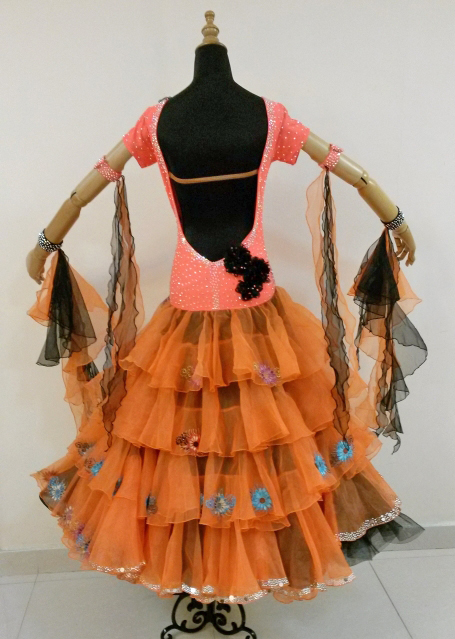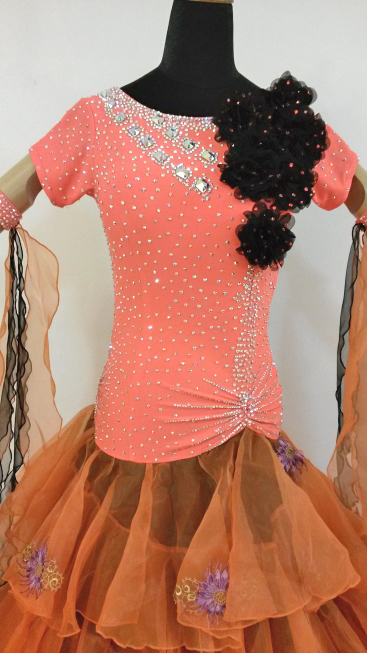 ボリュームたっぷりのティアードスカートのドレスです。スカートにはたくさんの花のモチーフがあしらわれています。半袖のデザインが可愛らしいです。